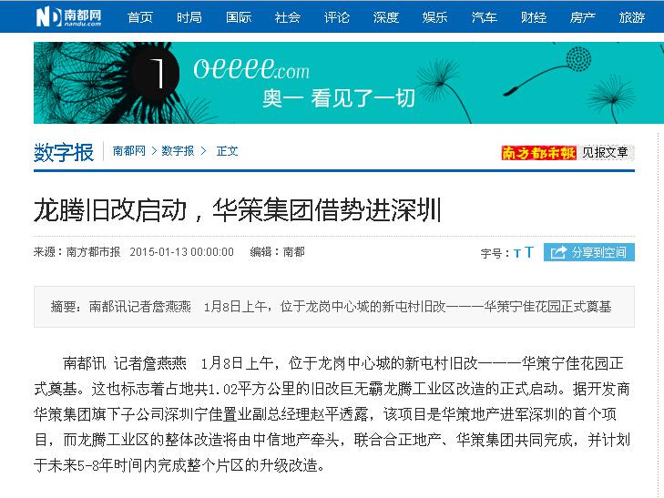 [深圳都市報]華策集團挺進深圳:華策·寧佳花園動工引各大媒體爭相報道發布時間: