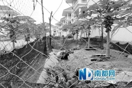 南都記者發現,許多別墅外表完好,內部較臟舊。屋前屋后都被開墾,種上了小白菜、蒜苗、番茄、蘿卜等農作物,綠油油長勢喜人。有兩三個人拿著袋子在里面采摘,詢問開發商信息都表示“不清楚”。往里走,居然還有搭建棚欄養雞羊的情況,四條狗穿梭其間,沖記者吠聲響亮,但都不咬人。