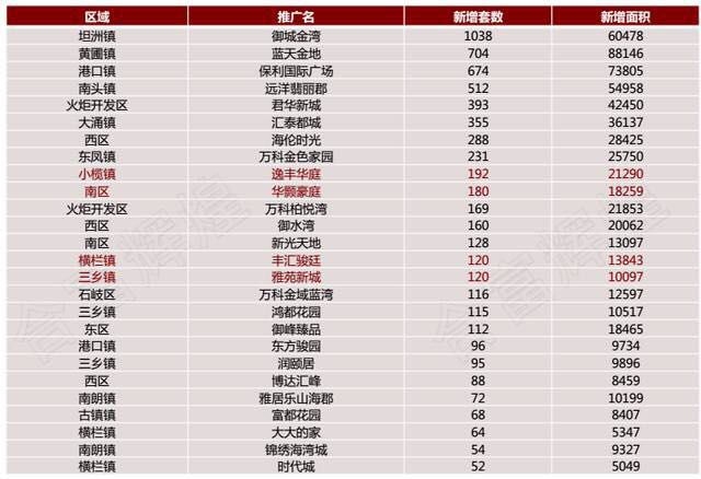 10月份共有26個(gè)項(xiàng)目新增,其中新增最多的是坦洲御城金灣1038套,黃圃鎮(zhèn)藍(lán)天金地花園和港口鎮(zhèn)保利國(guó)際廣場(chǎng)分別以704套和674套位列新增的第二和第三位。