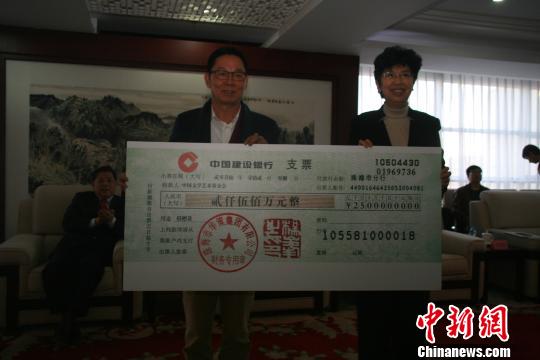 珠海市華策集團董事局主席楊峰(左)向中國文聯黨組書記、副主席趙實(右)捐贈2500萬元,用于翰墨薪傳·全國中小學書法教師培訓項目。