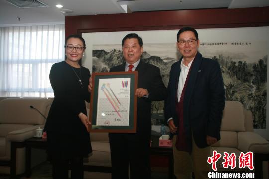 全國政協常委、中國文學藝術基金會理事長胡振民(中)向珠海市華策集團董事局主席楊峰(右)、董事趙日云(左)頒發捐贈證書。