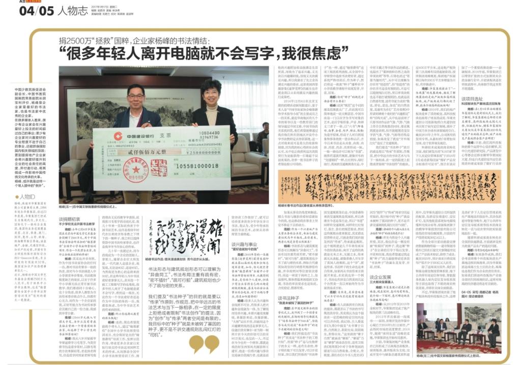 楊峰:其實(shí)也并非突然,作為中國書法家協(xié)會的任何一員,都對書法有著非一般的熱衷。面對當(dāng)今書法課進(jìn)入中小學(xué)課堂舉步維艱,書法教師極度缺乏的現(xiàn)狀,以至于許多中小學(xué)都無法正常開展書法教學(xué)。我們都感到十分痛心,也十分焦慮,很多人都想為書法傳承事業(yè)做點(diǎn)什么,但都有心無力。而作為一個企業(yè)家的我,正好有能力為書法傳承事業(yè)貢獻(xiàn)自己的一份力量,我感到非常自豪。