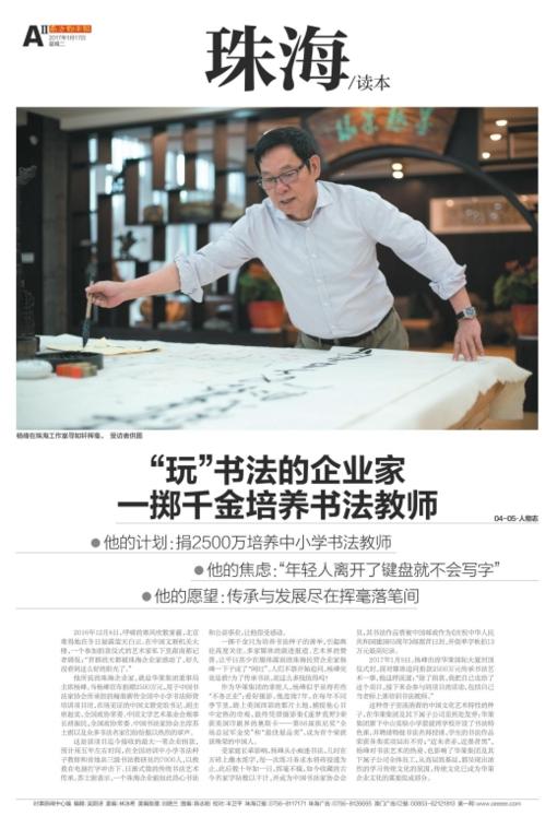 這是該項目迄今接收的最大一筆企業捐款,預計用五年左右時間,在全國培訓中小學書法種子教師和省地縣三級書法教研員約7000人,以挽救在電腦打字沖擊下、日漸式微的傳統書法藝術傳承。蘇士澍表示,一個珠海企業能如此熱心書法和公益事業,讓他很受感動。