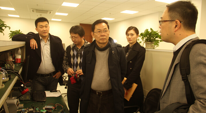 珠海市華策集團董事長楊峰(中)在國家半導體照明工程研發及產業聯盟副秘書長付強(右)陪同下,參觀半導體聯合創新國家重點實驗室常州基地LED白光通訊實驗室。