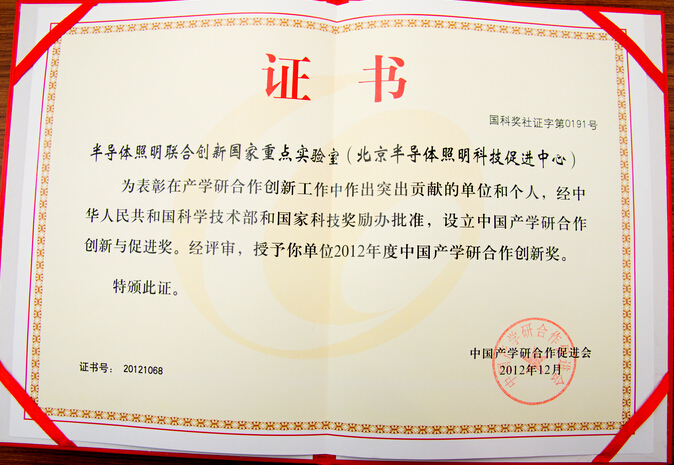 圖為半導體照明聯合創新國家重點實驗室榮獲中國產學研合作促進會“2012年度中國產學研合作創新獎”獲獎證書。