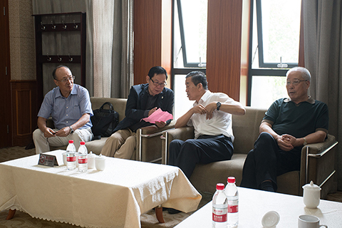 中國書法家協會“翰墨薪傳”學術指導小組副主任、華策集團董事局主席楊峰(左二)與中國書法家協會主席蘇士澍(左三)討論“翰墨薪傳”項目未來發展事宜