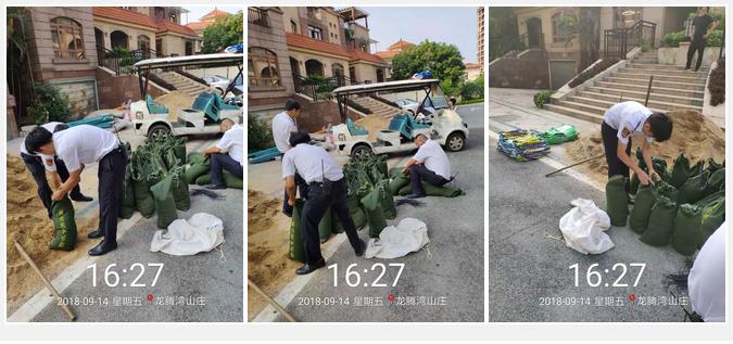 臺風(fēng)襲擊前48小時,應(yīng)急預(yù)案啟動,防汛沙袋等設(shè)施全部到位,各個小區(qū)保安隊挨家挨戶上門提醒業(yè)主關(guān)好門窗,做好安全防范措施,統(tǒng)一制定各服務(wù)中心工作人員值班制度,組織24小時應(yīng)急隊伍,隨時準(zhǔn)備應(yīng)對突發(fā)險情,各負(fù)責(zé)人牽頭現(xiàn)場指引,保證人車安全。