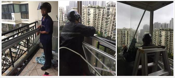 9月16日,臺風(fēng)吹壞了19-904業(yè)主家陽臺玻璃,維修班長黎孟宗和維修工張建賓頂著大風(fēng)大雨幫業(yè)主搶修