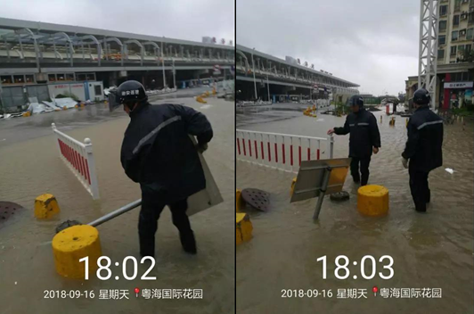 2018年9月16日下午海水倒灌,粵海小區(qū)大門口積水嚴(yán)重,粵海項目經(jīng)理陳廷勇、副經(jīng)理陶端智、經(jīng)理助理郭暉在現(xiàn)場清理沙井