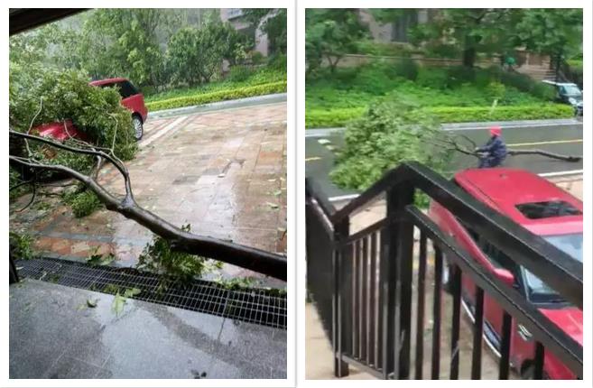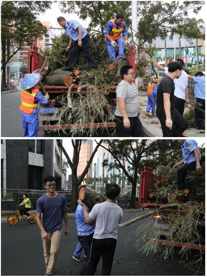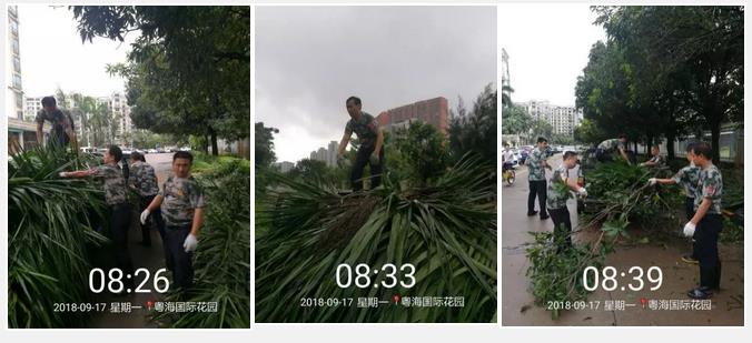 9月17日,粵海國際花園項目副經(jīng)理陶端智帶著秩序隊員清理小區(qū)損壞的樹木,項目經(jīng)理陳廷勇負(fù)責(zé)開車