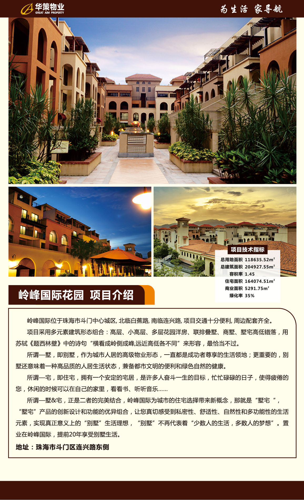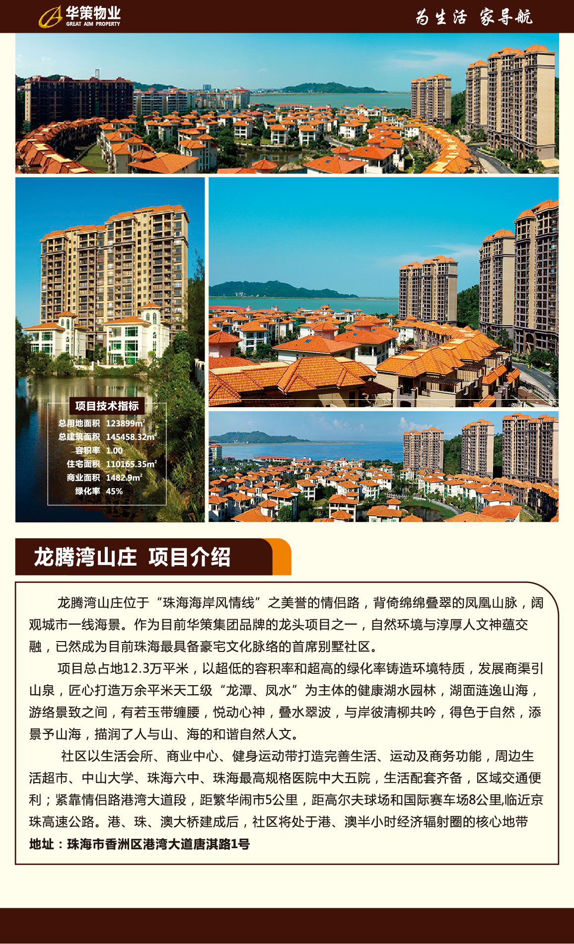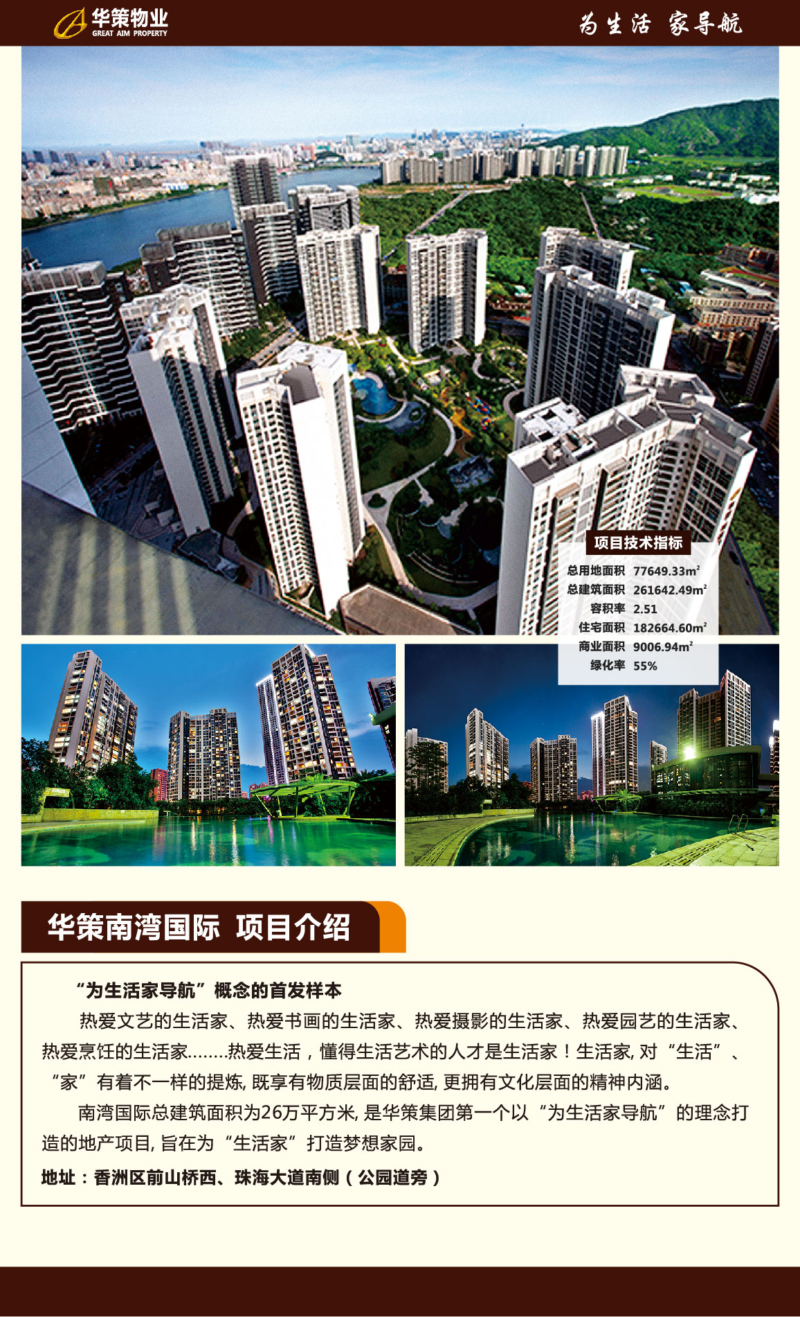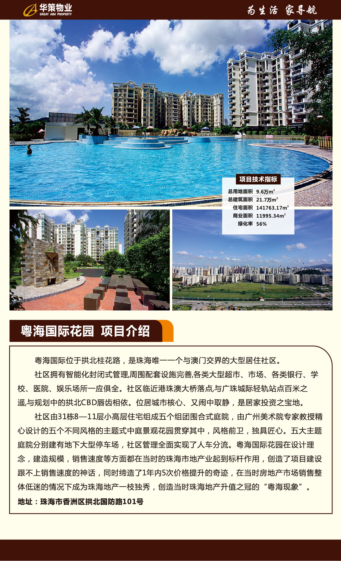 目前,華策物業管理的項目有珠海粵海國際花園、華策大廈、龍騰灣山莊、南灣國際、嶺峰國際、云浮·星科國際公館等,管理類型涵蓋高檔住宅小區、別墅、辦公商業樓宇等。其所管轄的各類物業先后榮獲多項省、市級以上的榮譽稱號。其中,粵海國際花園榮獲“全國物業管理示范單位”殊榮,南灣國際榮獲“珠海市物業管理優秀住宅小區”稱號。