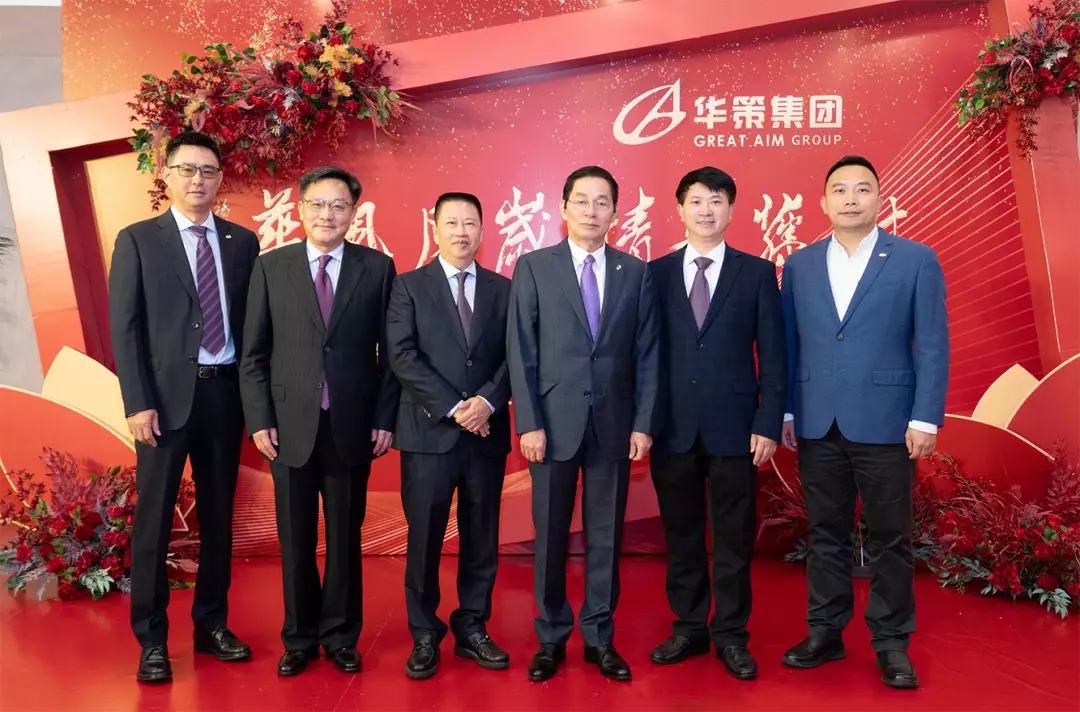 董事局主席楊峰(右三)、董事總裁余道群(左三)、董事常務副總裁梅合理(左二)、董事副總裁姚政(左一)、董事財務總監楊家瓊(右二)、董事副總裁陳曉斌(右一)