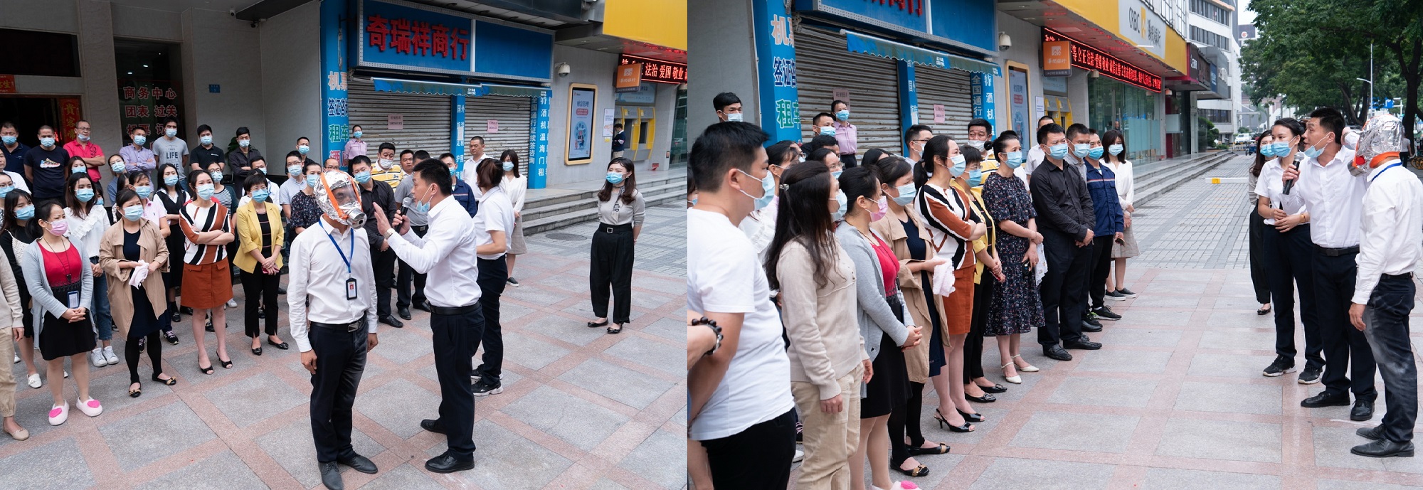 “起火啦!趕緊撤離!”下午5時,消防警報聲響起,華策大廈13樓發生“火情”,整棟大樓內的同事奔走相告。各部門人員紛紛跑出辦公室,在行政部門及物業團隊的指引下,以“彎腰低頭,捂住口鼻”的姿勢,沿著消防安全通道迅速撤離,僅2分鐘全體人員安全到指定集合地點。整個“緊急疏散”過程緊張、快速、有序。在“安全逃生”后,全體員工在大廈樓前集合,物業團隊對火災逃生注意事項和防毒面具、滅火器等使用方法進行了詳細講解。
