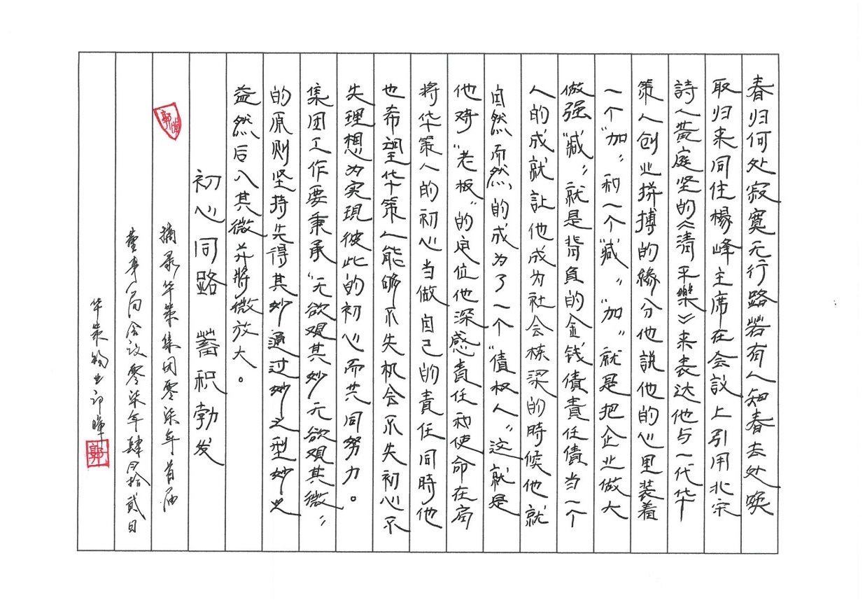 書法是中華傳統文化的符號,正如楊峰主席所講,“愿這個遠古(書法文化)在年輕一代中不再認為‘老土’,讓一代代人寫好中國字、做好中國人”,集團公司將繼續舉辦更多更好的文化活動,希望廣大華策人能夠在計算機應用普遍的今天,傳承、學習書法文化,汲取悠悠華夏那璀璨的文化內涵與精華。