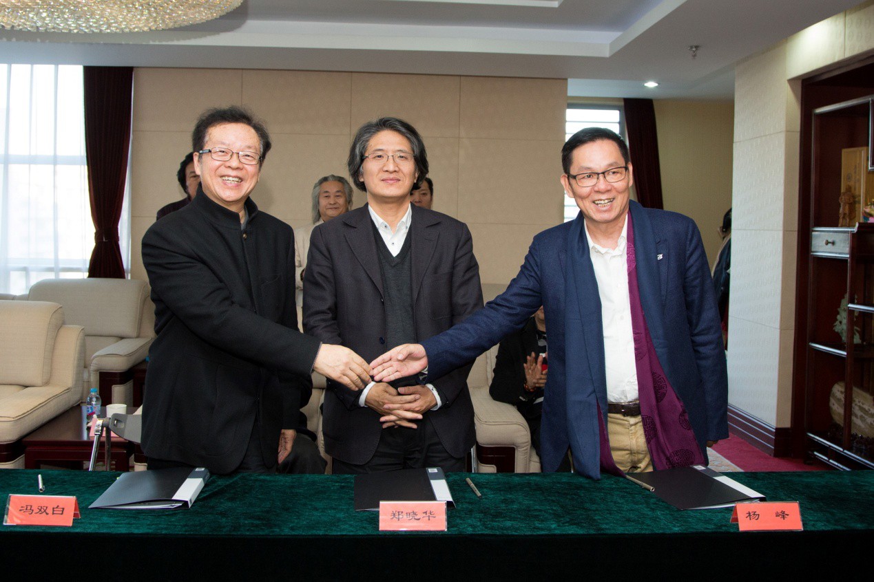 圖為楊峰主席與中國文學藝術基金會副理事長、秘書長馮雙白,中國書法家協會分黨組副書記、秘書長鄭曉華簽署捐贈協議