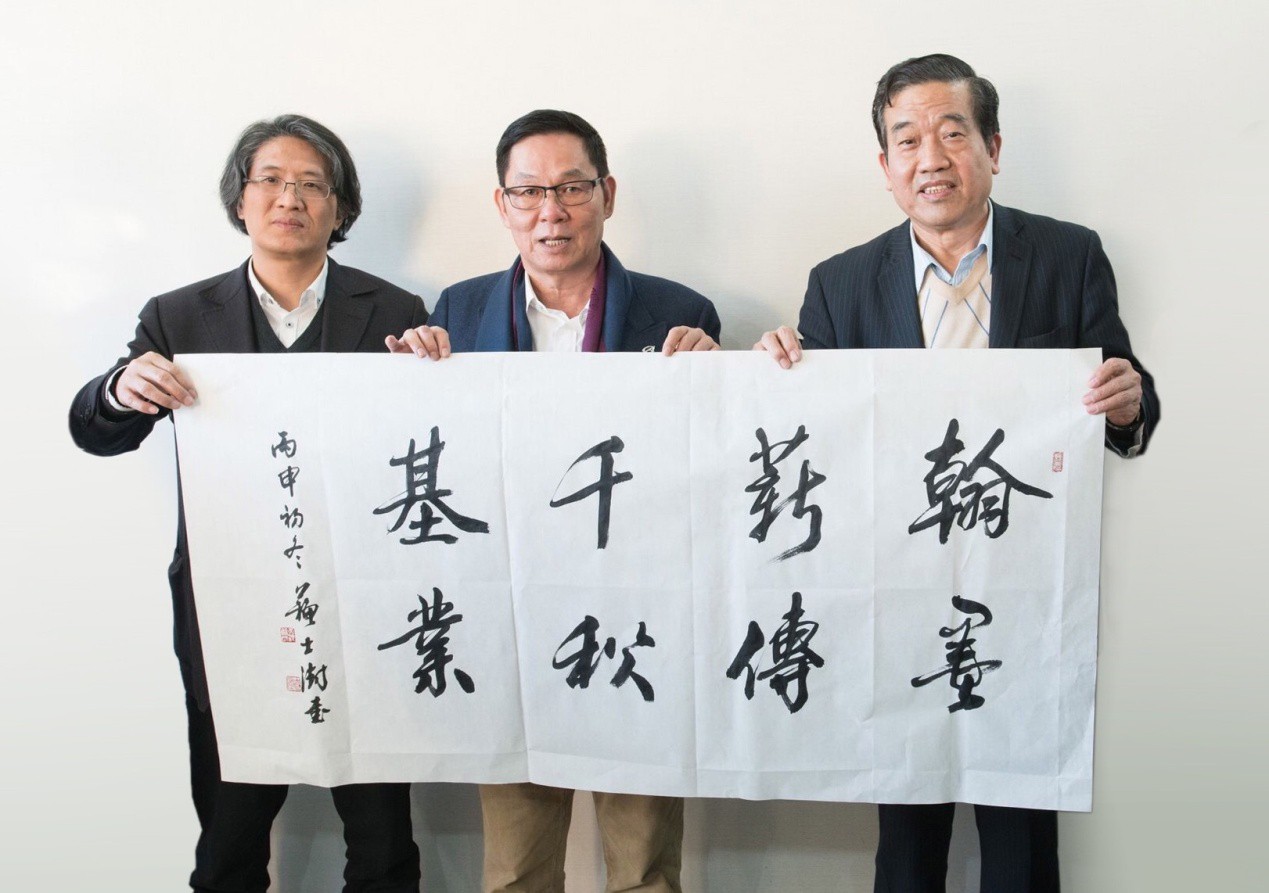 圖為楊峰主席、趙日云董事行政總監接受中國書法家協會主席蘇士澍(右二)所贈書法作品