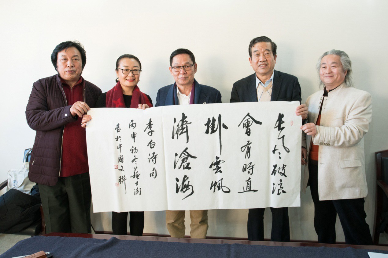 圖為楊峰主席接受中國書法家協會主席蘇士澍(右二)所贈書法作品