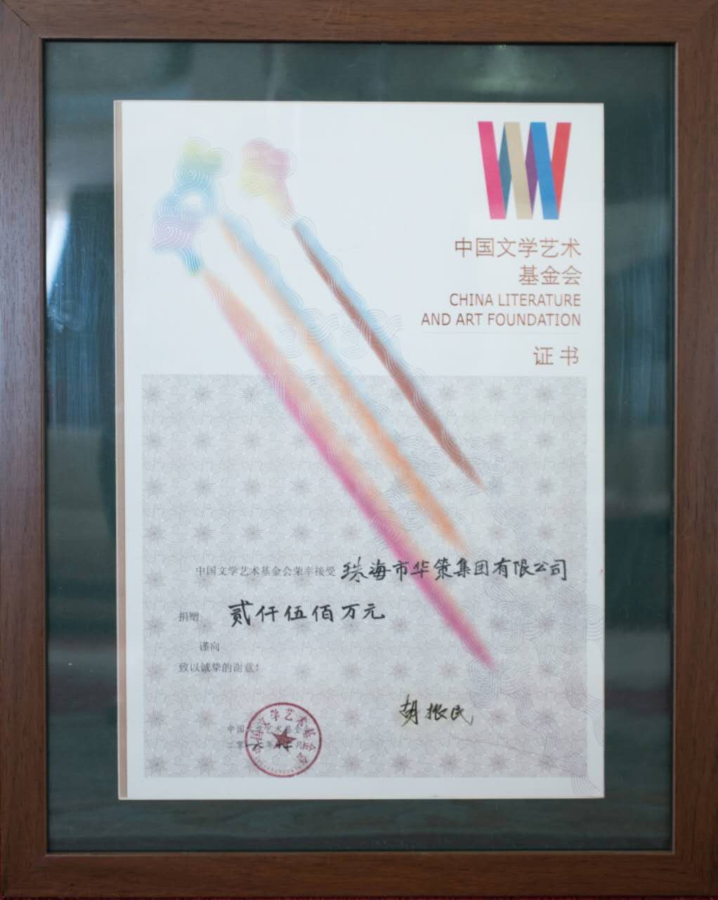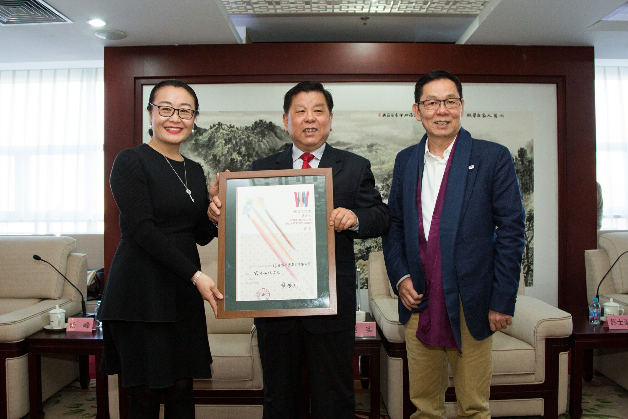 中國文學藝術基金會理事長胡振民向楊峰主席、董事行政總監趙日云頒發捐贈證書